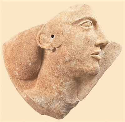 走进展厅,首先映入眼帘的是一块大理石女性头像浮雕圆盘残片。它来自米洛斯岛,年代约为公元前460年—前450年,圆盘上刻画的女性可能是古希腊神话中的美神阿佛洛狄忒。她浓密的头发束成一个髻,露出修长的脖颈,散发着优雅之美。