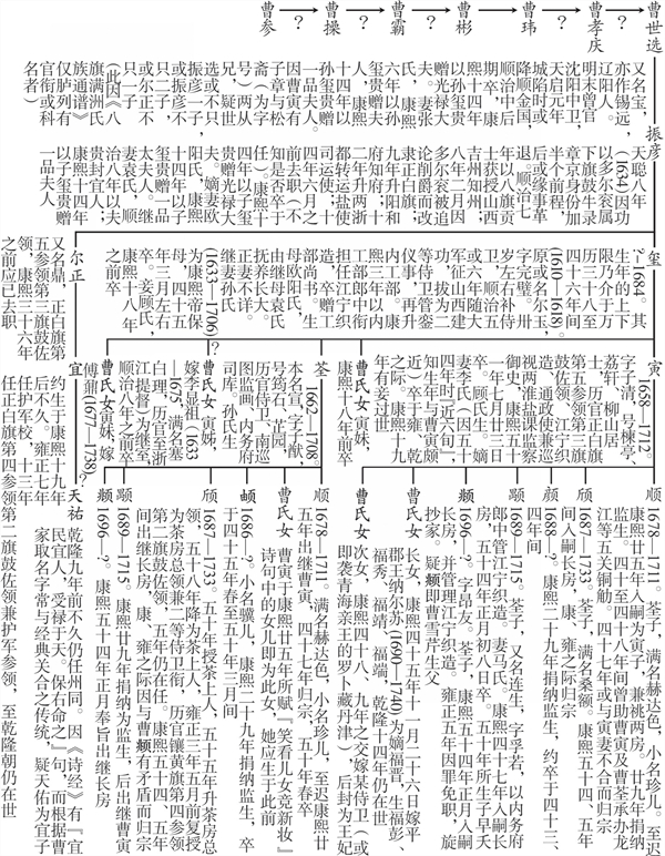图表1.1 曹雪芹家族世系图。订正自拙著《二重奏:红学与清史的对话》