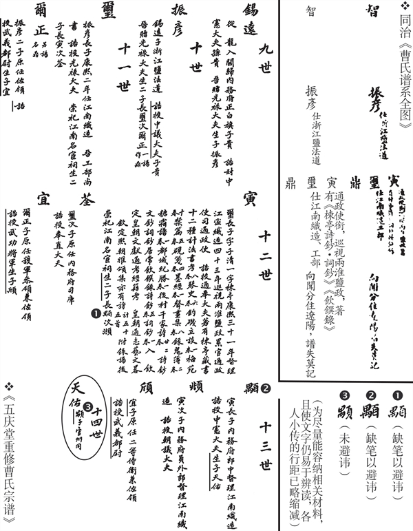 曹鼎望在其监修的康熙《南昌武阳曹氏宗谱》中,不仅将武阳曹与丰润曹合谱,并期望未来能考订渊源,补足“辽阳一籍,阙焉未修”的情形(图表1.10)。曹寅亦认同武阳曹(标举曹孝庆为其始祖),并以丰润曹与辽东曹乃同支,遂与鼎望三子钊、鈖、鋡骨肉相称,且用位于隆兴府的柳山为号(间接指称其家源出曾知隆兴府的曹孝庆)。事实上,学界对曹雪芹家族在宋元之前和辽东之外先祖(曹参、曹操、曹霸、曹彬、曹玮或曹孝庆等)所进行的追索,恐已很难得到合乎史实或基于血缘的客观关系。然曹家对显祖的自我定位,不仅重塑了家族的历史感与文化层次,更透过联宗通谱成功开展了一连串的社会网络。
