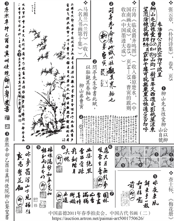 另,曹寅亦透过别号“柳山”显露他对远祖的认同。曹寅幕友张云章尝称其“柳山先生”,并注称“公以柳山自号”。查士标《梅花册》上有六幅画的题诗署名“柳山”,且钤用“曹寅之印”“荔轩”“楝亭”“楝下客”。博尔都(字问亭)命曹寅在石涛所绘《临众爵齐鸣图》写赋时,寅自署“柳山弟”,图上曹寅手书的“云汉高寻”引首,亦署“柳山寅题”,并钤“楝亭”等印。石涛为博尔都临摹的《蓬莱仙境长卷》上,也有“柳山寅题并识”之跋。此外,曹寅自序《太平乐事》杂剧时,末署“柳山居士”;在题明·马守真(号湘兰)所画之《兰竹》时,署名“柳山聱[音‘敖’]叟”(因其曾患“耳闭”之疾);且于《北红拂记》末题“柳山自识”,程麟德跋此书时亦盛赞“柳山先生材大如天”(此段参见图表1.8)。
