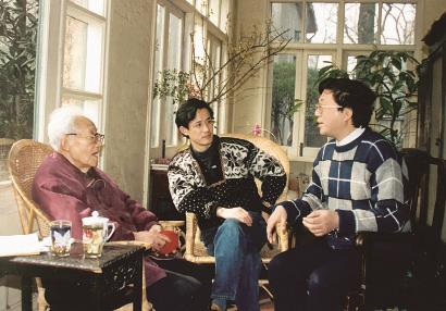 自左向右:巴金、李辉、陈思和 资料图片