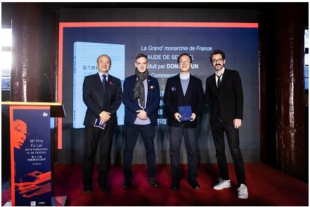 从左到右:中方特邀嘉宾汪家明,社科类获奖者曹丹红,法国驻华大使馆文化、教育与科学事务公使衔参赞裴国良,傅雷奖常任评委端木美