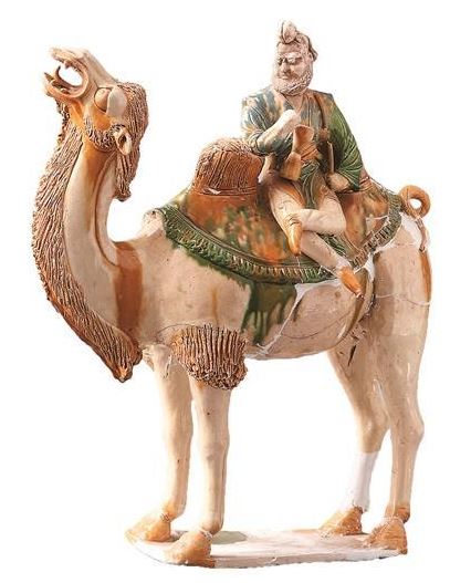 盛唐时期,许多外国人定居中国境内,不少人落户长安。他们从事各种职业,其中一些人甚至在朝廷中担任要职。唐代墓葬陶俑中经常出现外国人的形象,是这一时期社会风貌的真实写照。三彩胡人骑驼奏乐俑出土于西安市长安区。骑在骆驼上的胡人乐师鼻梁高耸,胡须浓密,身穿长袖翻领长袍,足蹬尖头鞋,侧身而坐,双手各持一支鼓槌,胸前系着一面鼓,仿佛随时准备击鼓伴奏、高歌一曲。骆驼头部高扬,张口嘶鸣,似与乐师和鸣。这件充满动感的文物,生动塑造了胡人乐师的形象,印证了丝路文化交流。