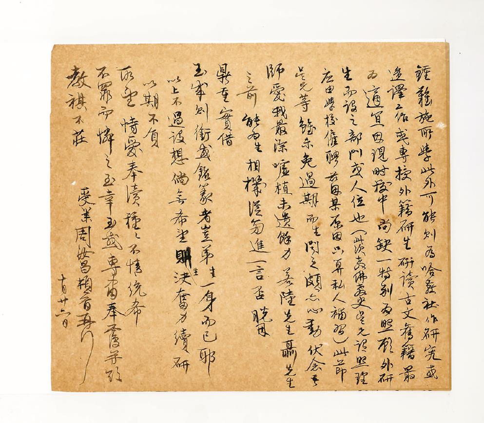 承索拙稿,本可以立即奉去,奈该物前此已为一至友持去,为日已多。生亦正思籍此取回,因去函说明原由,请其送还。乃今日得覆,谓该物已转入第三人(亦系至友),该君与出版家稍有瓜葛,意欲印行,正在审读中,一时不能交回去。此事并未预(兆),生之意见□吾师知。私意该物□随未必有人皆印行,不(过)一谈而已。然一时竟不能索回,师多次嘱(询)及此,仍不能送上,实深罪疚,恐未明委曲,谨以奉闻,乞谅至幸。一竢何时取回,即当携去。请勿念。专上,并候节祺!不庄。