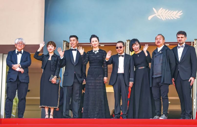 2024年5月18日,在法国南部小城戛纳举行的第77届戛纳国际电影节上,影片《风流一代》导演贾樟柯(左三)携主创出席首映礼。新华社记者高静摄
