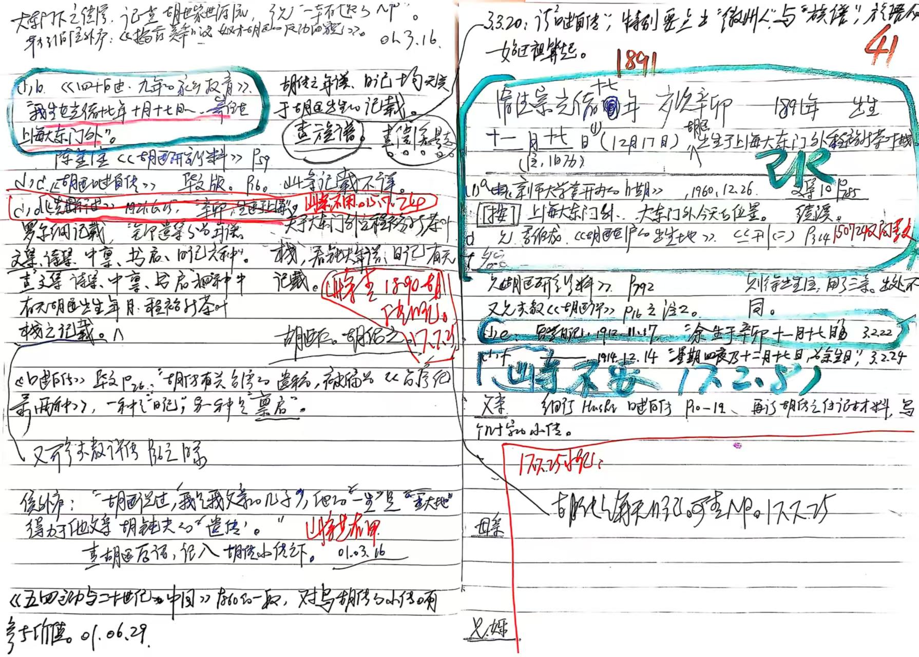 《胡适年谱长编》“1891年”笔记之一页,1999年开始做此笔记时尚无个人电脑