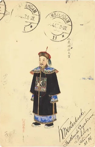 清二次片,周培春绘《头品文官》,邮路:1907年2月28日经北京的德国客邮局收寄,于同年的4月14日到达荷兰的阿姆斯特丹