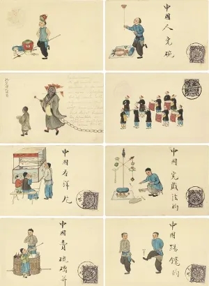因此,那些带有异国风情的市井图,便格外受到欢迎:顶缸、玩碗、修伞、当铺、夜巡、舞龙、逗猫、钉马掌、西瓜摊、耍火球、荡秋千、僧人化缘、童子乐队、妇女吸烟、龟奴驭妓、鼓弦说唱、冰床运客、冬日堆雪狮子等等,三教九流,五花八门,烟火气十足,仿佛是“晚清上河图”的“蒙太奇”。在一组二十枚民俗套片中,还赫然写上“中国人玩碗”“中国人看洋片”“中国人玩戏法”“中国人踢毽子”“中国瞎子”的书法。对画者来说,这些现象司空见惯,用不了多此一举,所以以“中国人”为前缀,等于为奇异事物注解,简单粗暴的背后,正是殖民主义者的观看欲望,实在忍不住大惊小怪。