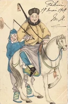 以唯一可鉴的北京画家周培春为例,或许便是这种情况。他画过《满清文武官员品级图册》(现藏大都会博物馆),也画过《清代商铺招牌幌子图》,这些组画是清宫一种工具式绘画类型,画法不求艺术性,照实描摹足矣,以标准图鉴样式归入内府档案。细看周培春严谨细致的画功,他极有可能原先乞食宫中,因而对文武大臣的服饰举止了如指掌,明信片便手绘出“此是六品武官”“此是头品文官”“官员骑马”等官场行状,朝服品级制式准确无误,还有“清兵试火枪”“双人抬枪射击”等军情实录,可见周培春所闻皆禁中所见,见识远高于一般平民画家。有趣的是,从明信片上的邮票、邮戳信息得知,委托者与画面内容身份吻合,文有荷兰领事馆外交官,武有德国海军军官,显然是向熟悉清廷内情的画工特别定制的,在其他手绘明信片中,此类题材绝无仅有。