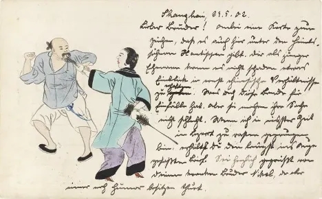 商行明信片《悍妇殴夫图》,邮路:1902年5月23日上海德国客邮局收寄,6月30日抵达德国雷根斯堡(Regensburg)