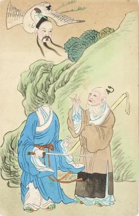 猎奇在继续,该轮到神话出场了,这也是手绘明信片通常引用的类型,各地均有出神入化的例证。虽然传说、仙道和戏曲故事不是现实世界,但毕竟寄托了人们的精神幻想,订制者也乐于沉迷于古老的梦境之中。在制作这类题材时,即便范本在前,画家仍能凭借想象力天马行空,不时得神来之笔——童子驭龙、童子驭鸟固然讨彩头,但远不如虚构人物更易于放浪形骸:“西游记”师徒中的孙悟空,伸出极夸张的大长腿,有着即兴描绘时的痛快淋漓;《封神演义》的申公豹,头颅可怖地在空中飘荡,要是联想到这些图像作于改朝换代的一九一三年,就不难理解其魔幻的现实依据,正是城头变幻霸王旗的乱世斗法,与街头大变活人的魔术戏法一样,不过是纸上显灵的活报剧而已。
