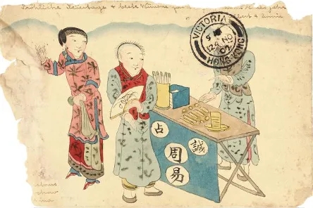 清二次片《算卦图》,邮路:此片1907年阴历10月16日福建福州寄出,11月24日在香港中转后,12月27日到达德国城市
