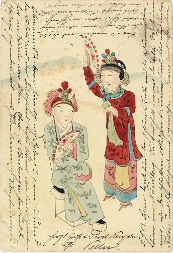 手绘明信片诞生在这个“机械复制”为时髦的时代,显然是不合时宜的。实用品以人工绘制,耗时又费力,但附着于邮政明信片,反倒是旧瓶装新酒,是一种深入浅出的新玩意儿,在对东方抱有猎奇心态的使用者,也就是那些来华洋人看来,明信片不费巨资,却难得手工定制,不仅别出心裁,品位还不凡,值得向远方的亲人炫耀。