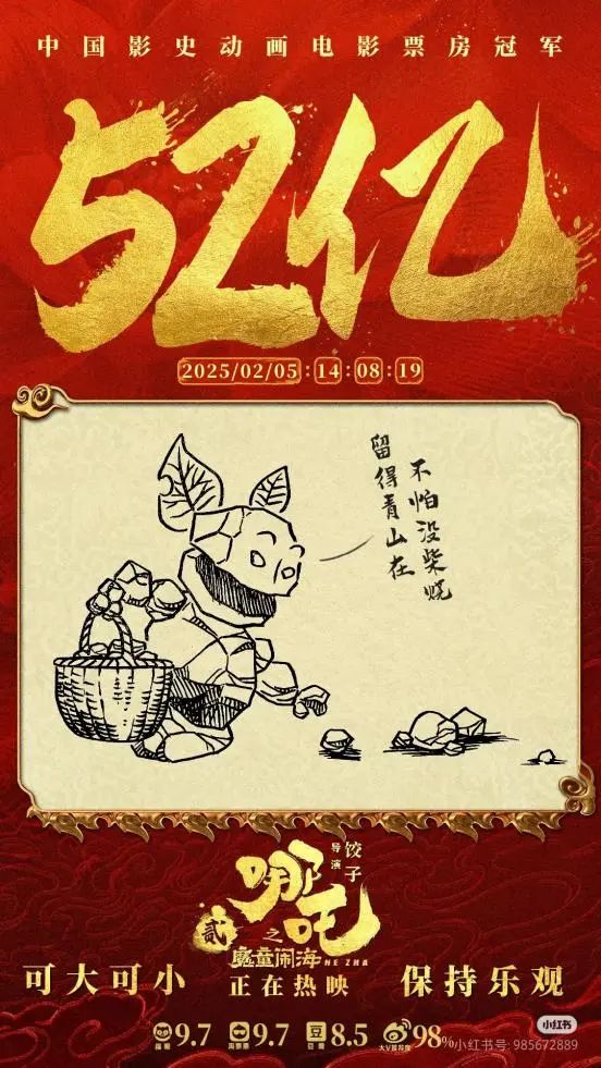 2025年春节期间,六部前期宣传颇丰、影迷期盼已久的“重磅电影”同时上映,被称为史上最强春节档,竞争激烈可想而知。暌违五年,与侦探推理、神话史诗、武侠、军事等各路强悍IP同场竞技,作为中国影史动画票房冠军续作的《哪吒之魔童闹海》势如破竹,粉碎“续作难出佳作”的魔咒,续写了中国动画影史的神话。据灯塔专业版数据显示,截至2月6日,影片票房已突破58亿元,超过《长津湖》成为中国影史票房第一,同时成为中国影史春节档票房冠军。与此同时,数据仍在不断翻新当中,有网友戏称,“吒儿的含金量还在不断上升”,一盏茶的工夫,纪录就有可能以亿元为单位被不断刷新。影片制作方之一彩条屋影业小红书官方号甚至成为众多影迷、网友“喊话”饺子导演的留言板,“正是拼的年纪,不能躺,快起来开拍哪吒三啦”。