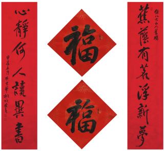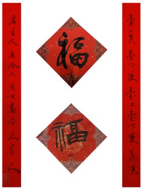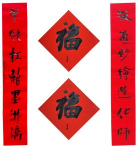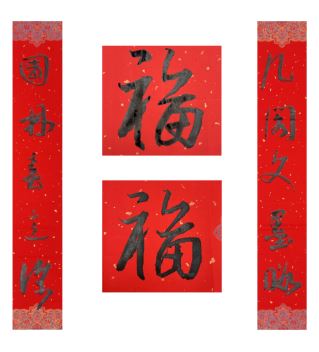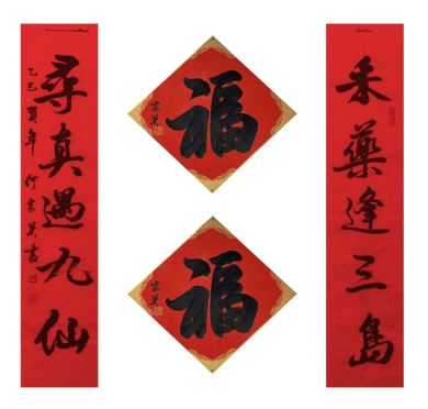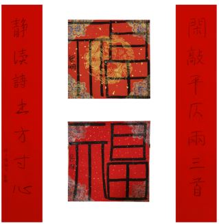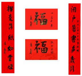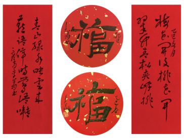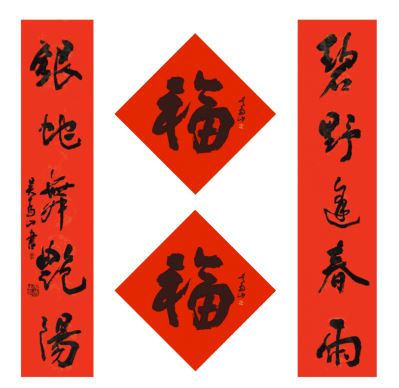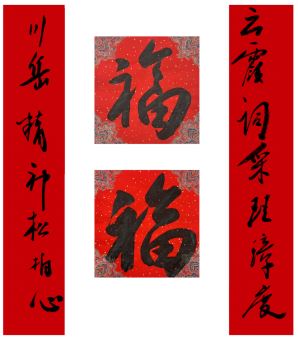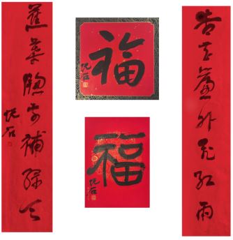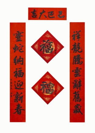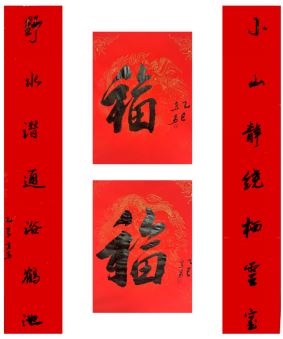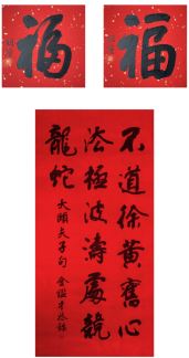 中国美术家协会名誉主席、中央文史研究馆副馆长冯远书对联:“祥龙腾云辞旧岁,灵蛇纳福迎新春。”