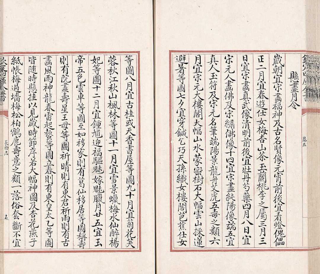 十七世纪初,文震亨(1585-1645)借用《世说新语》“身无长物”的典故,将对琴棋书画、饮馔、服饰、器用、造景的见识,汇编成《长物志》。当中“悬画月令”是藉居家布置的挂画内容,表现每月对应的景致、草虫或岁时活动。