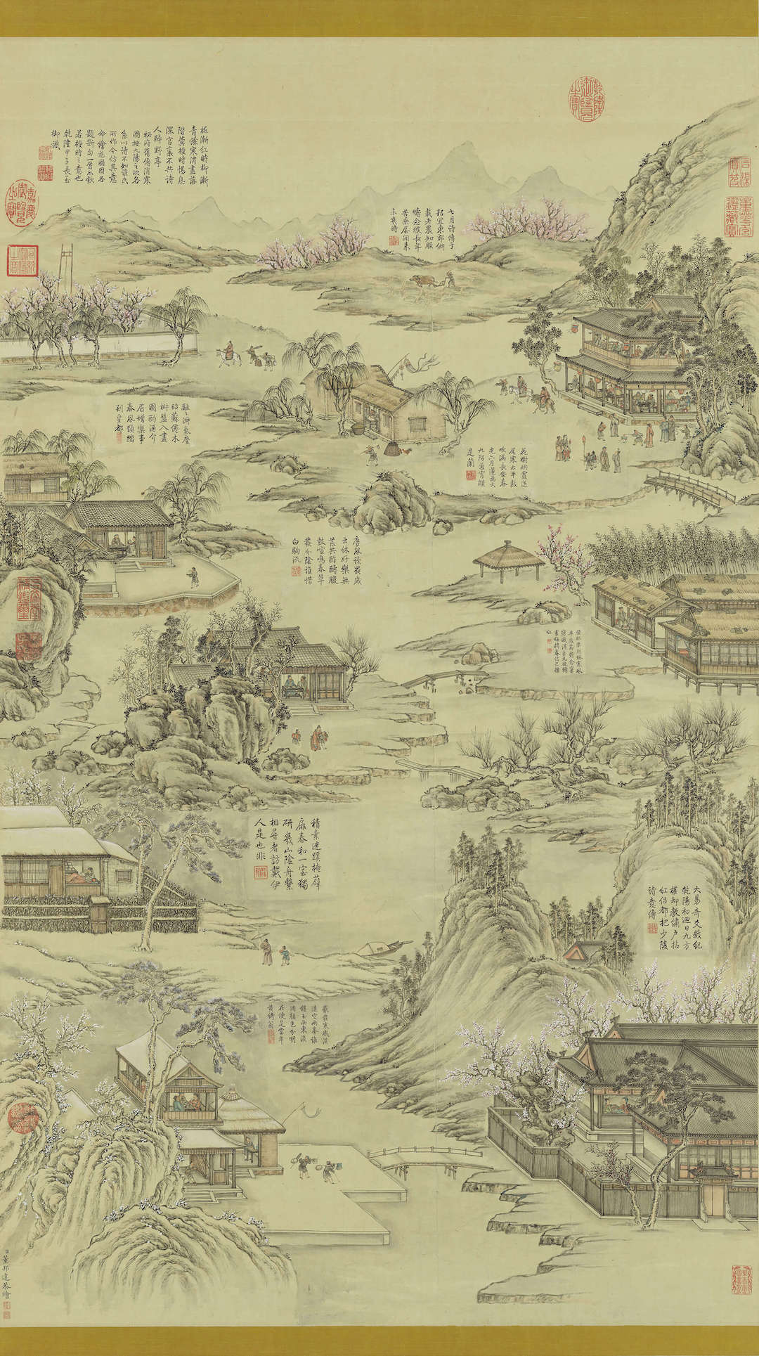 据《酌中志》记载,冬至时明代司礼监会印制“消寒图”版画供宫廷使用。《九阳消寒图》为乾隆皇帝命词臣画家董邦达(1699-1769)模仿清宫旧传的消寒图所作。画中以俯瞰视角描绘贯穿前后景的“之”字形蜿蜒河道,岸边每一场景配置一首诗,以九首诗庆祝冬天转为春天的时序变化,另有衍伸“君子道长,小人道消”的帝王理想政治情景。