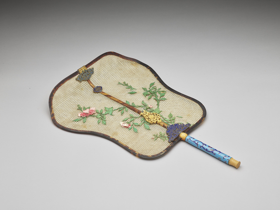 此蕉叶形扇的扇面由象牙劈丝后编织而成,并缝缀染骨组成月季花丛。扇框包镶玳瑁,扇柄与柄樑分饰内填珐琅与湘妃竹,其两端嵌云福纹饰件。