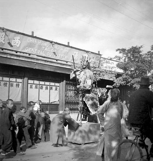 这些影像并非猎奇式的西方凝视,而是以平实的视角捕捉着鲜活的瞬间:她拍摄了胡同里的剃头匠、茶馆中听评书的市民、庙会上的杂耍艺人,展现了北平的社会肌理;她对古建筑情有独钟,镜头下的故宫角楼、颐和园长廊、西山寺庙,既呈现建筑细节,也记录其与周边环境的共生关系;春节期间的舞龙表演、葬礼上的纸扎工艺,甚至偏远乡村的社戏场景,民俗百业均纳入她的影像档案。