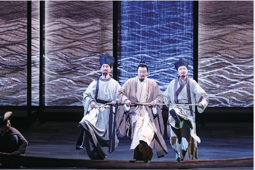 记者:舞台上有一场戏堪称绝妙:一叶扁舟上,苏轼、王安石、司马光三人上演的“盗梦空间”式“跨越时空”的对话,比如处理水患灾情时,苏轼要召开新闻发布会,甚至说要开直播……这些看似随意甚至荒唐的表达和演绎,给观众带来一种新鲜的、自由开放的演剧体验观。剧中有借鉴中国戏曲中的可变性、流动性、空间结构,也有借鉴西方戏剧的多种技巧,这样非线性、开放式叙事结构,有着怎样的匠心?