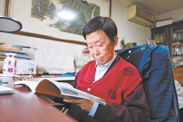 田连元酷爱阅读,博览群书。记者 刘英文摄