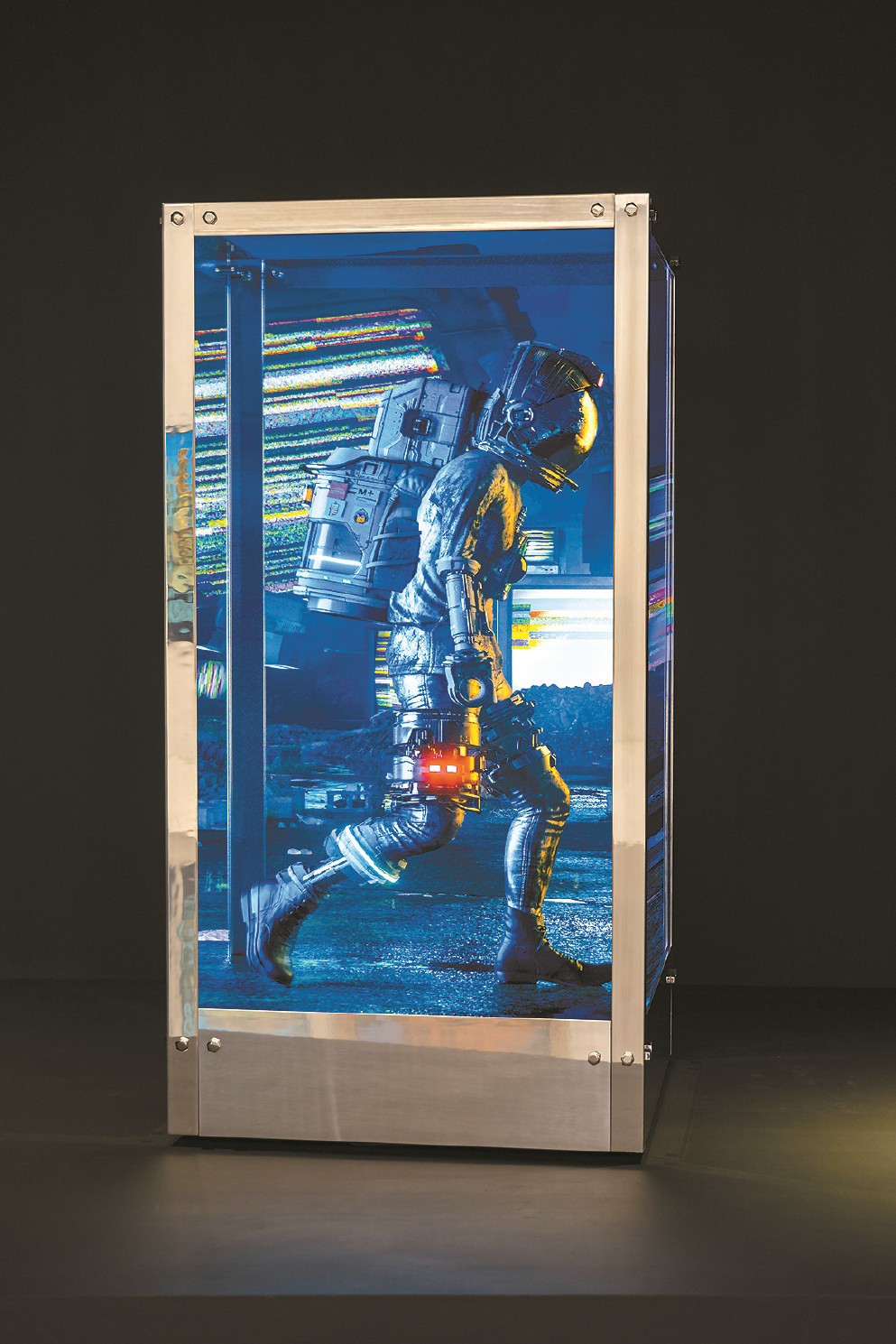 在动态雕塑《人类一号》(2021年)过程中,Beeple试图通过作品在美术馆与博物馆系统中的生长与巡回性展览,来挑战作品的生命长度。《人类一号》是Beeple创作的首件动态雕塑作品。立方体中,身着宇航服与头盔的“旅行者”是第一位诞生于元宇宙虚拟世界的人。他于2021年10月亮相,已走过第一章“人类诞生”(佳士得纽约洛克菲勒中心艺廊)、第二章“一场持久战”(意大利都灵利沃利城堡当代艺术馆)、第三章“兔年”(香港M+博物馆)、第四章“完全消失”(美国水晶桥博物馆)、第五章“奇点:第一阶段”(南京德基艺术博物馆),目前正走在第六章“半人工虹”(日本东京森美术馆),并将永不停歇地走在变幻无穷的虚拟景观中。