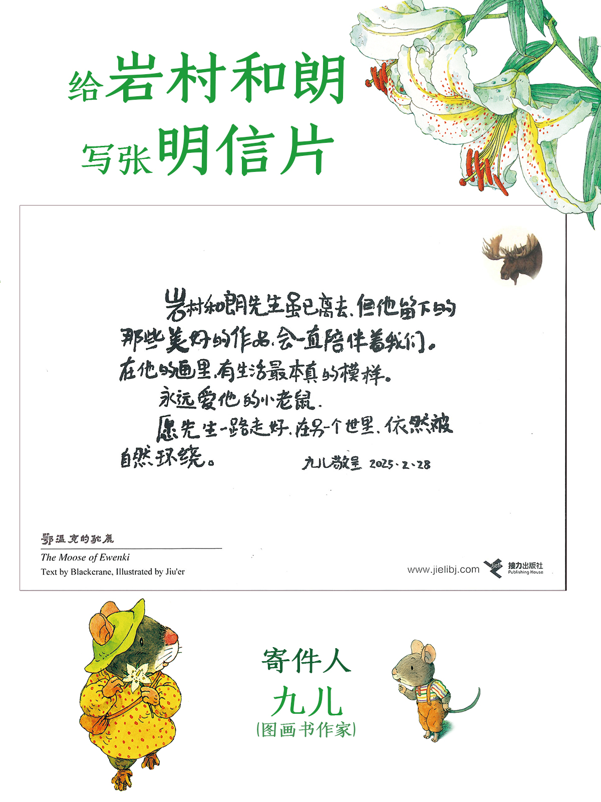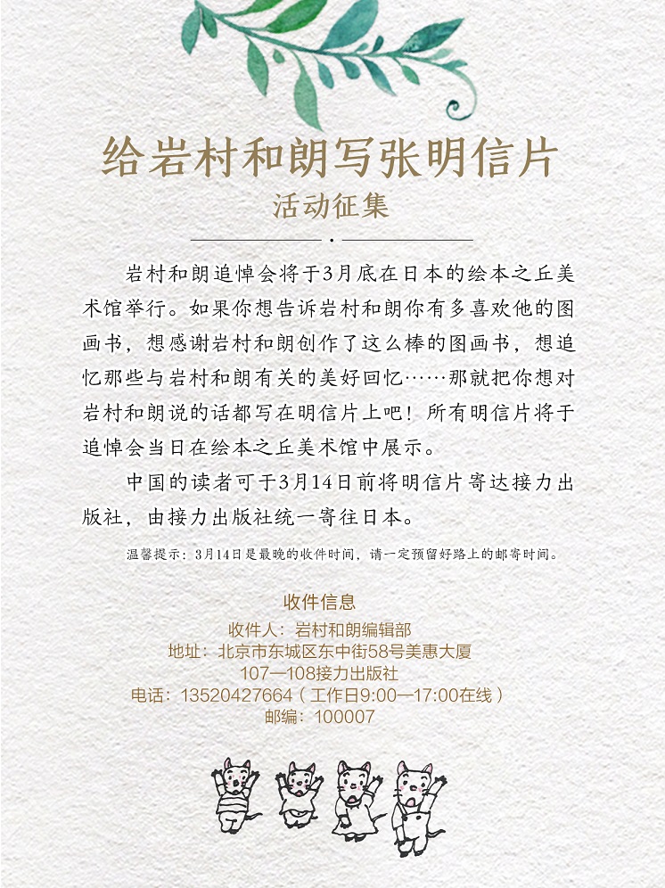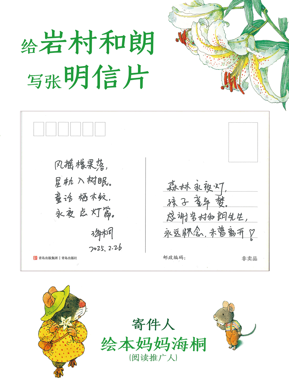 为深切缅怀岩村和朗,接力出版社于2025年2月发起了“给岩村和朗写张明信片”活动,诚挚邀请广大读者通过邮寄明信片的方式,寄托对岩村和朗的无尽追思。