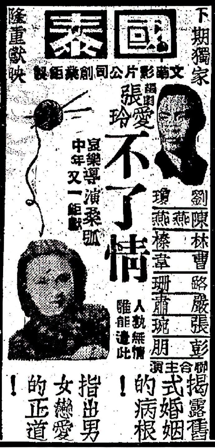 影片《不了情》在国泰戏院的上映时间不长,从5月23日到31日,仍是“连日满座”,似乎应和与印证着海报上的那句:“人孰无情,谁能遣此”?