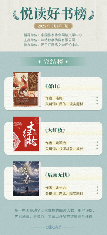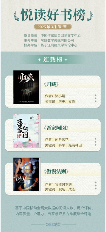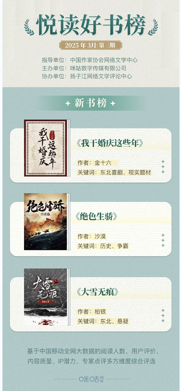 悦读好书榜每月更新,诚邀广大读者、作家及出版从业者持续关注,共探网络文学新图景。咪咕阅读将持续深耕优质内容创作生态,搭建创作指导平台,强化内容生态建设,通过专业化服务体系助力文学创作与阅读体验的双向提升。与此同时,深化作品IP价值开发,探索文学创新表达路径,构建多方协同的产业生态,促进行业生态良性发展。