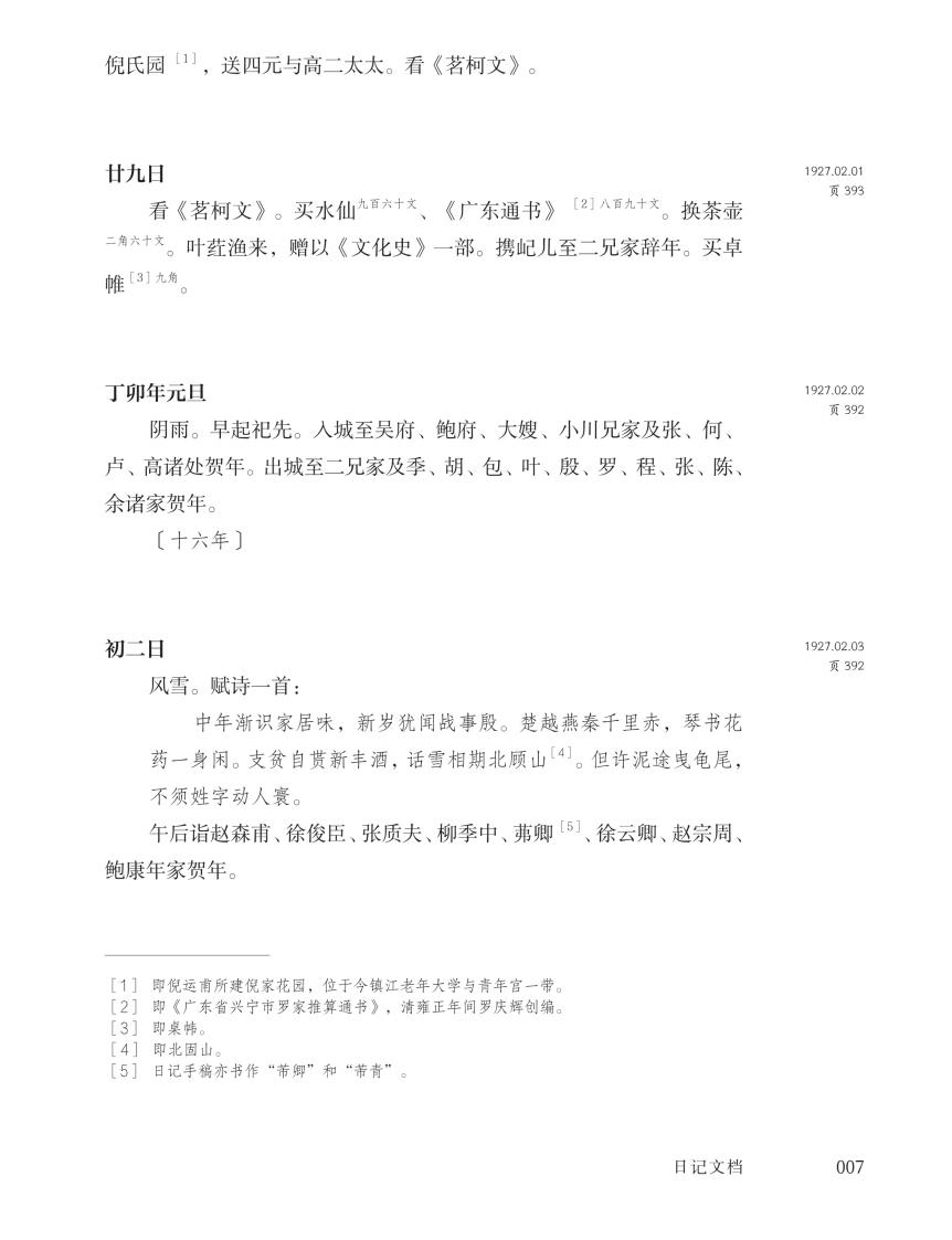 《日记》在详载先生勤勉不懈、真诚坦率和温馨亲情方方面面的同时,也真实再现了先生亲历的风云变幻,内容殷实,颇值查究。1925年3月,东南大学爆发“易长风潮”,先生牵涉其中,愤而北上,辗转东北大学、北京女子大学和北京高等师范学校等处。1927年1月19日,也就是本册日记的开篇,先生完成当日手头工作,便即行整拾行装,于次日下午4时半,从正阳门搭乘火车经天津南归,颠沛流离的北漂生活至此画上句号。23日上午火车抵宁,短暂停留便再次搭乘火车返回故里镇江。