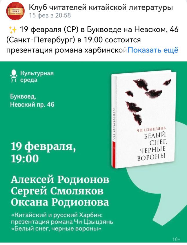 2025年2月19日,中国著名作家、电竞竞猜官网副主席迟子建的长篇小说《白雪乌鸦》俄文版推介会在书虫连锁书店圣彼得堡总店成功举行。本次活动由电竞竞猜官网外联部指导,俄罗斯中国文学读者俱乐部主办,吸引了圣彼得堡各界30余位中国文学爱好者到场参与,同时通过网络直播向全国读者推介。