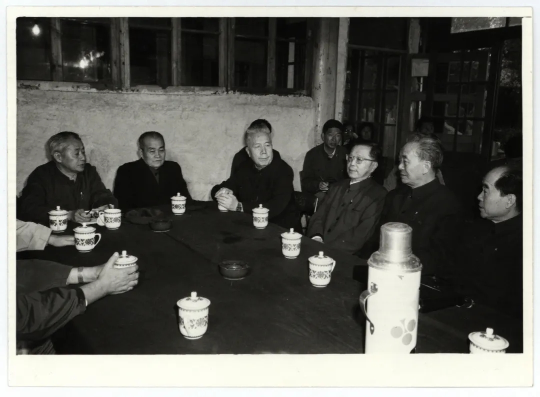 中国现代文学馆筹建处成立照片,与会者讨论中国现代文学馆的筹办事项,围桌者右起:孔罗荪、艾青、曹禺、周扬、胡乔木、朱子奇、贺敬之。