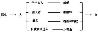 本文中的“虫”指节肢动物门昆虫纲动物,如苍蝇、蚊子、蚂蚁等。按照隐喻类别,鲁迅笔下的虫可分为“原虫”“蚊蝇”“细腰蜂”“槐蚕和蚂蚁”“小青虫”,他们分别隐喻“进化链条上的低级生物”“虚伪的学士文人(奴才们)”“治人者”“密密麻麻的看客”“自我和同道人”。