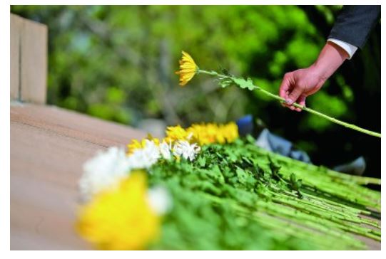 4月3日,人们在位于江苏省句容市茅山风景区的苏南抗战胜利纪念碑前敬献鲜花。新华社发