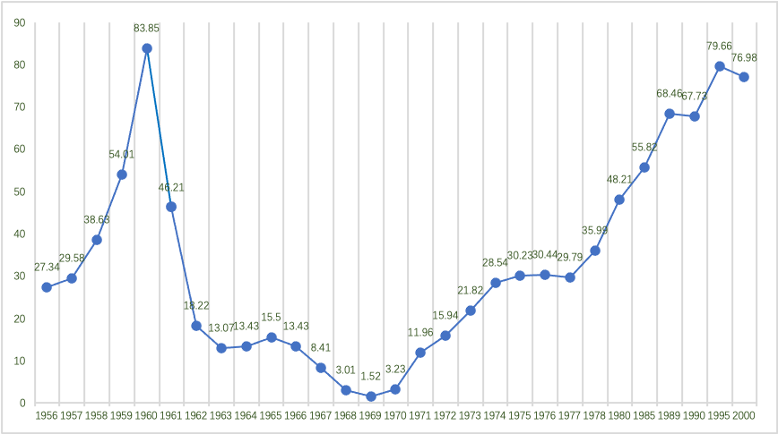 1956-2000年全国中等师范学校在校学生人数统计图(单位:万人) 数据来源:申国昌等著:《中国师范教育发展史》,北京:科学出版社,2021年,第226-227、256页。