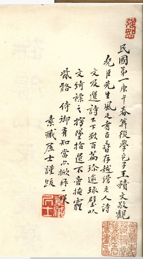 然而,历史又如此有趣。鲍存晓儿子鲍元晖,字尧臣,富而好文,民国间从李慈铭后人手中购得其著述稿本,今藏上海图书馆的《越缦堂所著书》稿本九种,即是藏品之一,钤“鲍元晖”“尧臣”白文二印。其一《萝庵日抄》,卷二末王积文跋云:“右《萝庵日钞》,……。汲脩主人尧臣先生得诸李氏后人。见其篇附考证,评骘谛当,装裱成帙,洵有心人也。愿鲍氏后晜当缣眎之。庚午莫春后学邑子王积文谨跋。”庚午当是民国十九年(1930)。鲍元晖并请乡友王继香、王积文、曹振采、孙豫、孙步瀛、素臧居士、健堂等人题跋《越缦堂所著书》,又于民国二十一年(1932)跋《萝庵游赏小志》云:“所谓叙吾乡山水情景,不啻如绘。奇文妙笔,如身入其中,俗虑顿销,明月清风朗然,在贶我诚不少矣。”(《越缦堂所著书》,上海图书馆藏稿本)对李慈铭描绘山阴道上山水风情尤三致意焉。