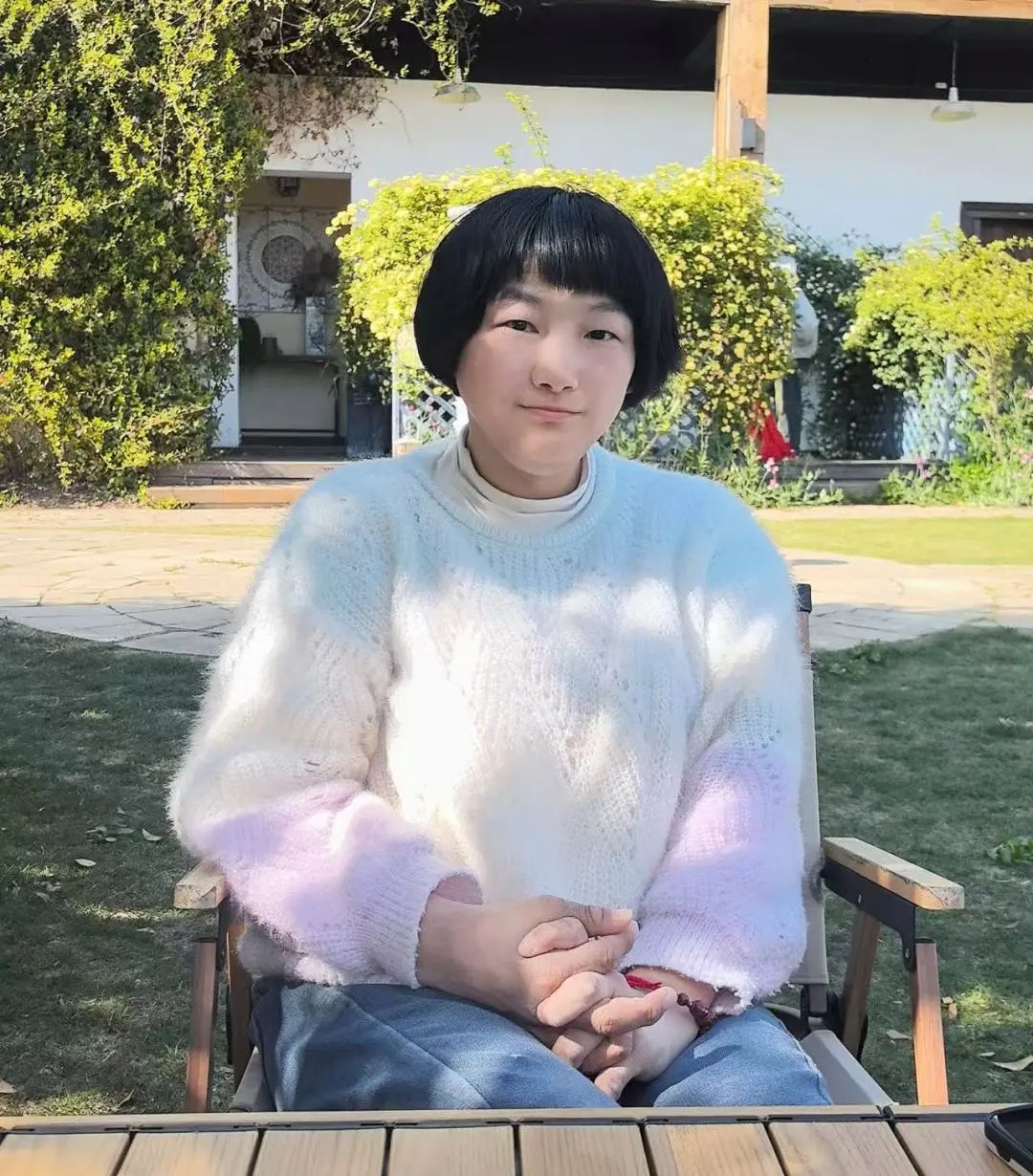 不一会儿,糖橘从草丛中瞧准时机蹦到了奶奶腿上。