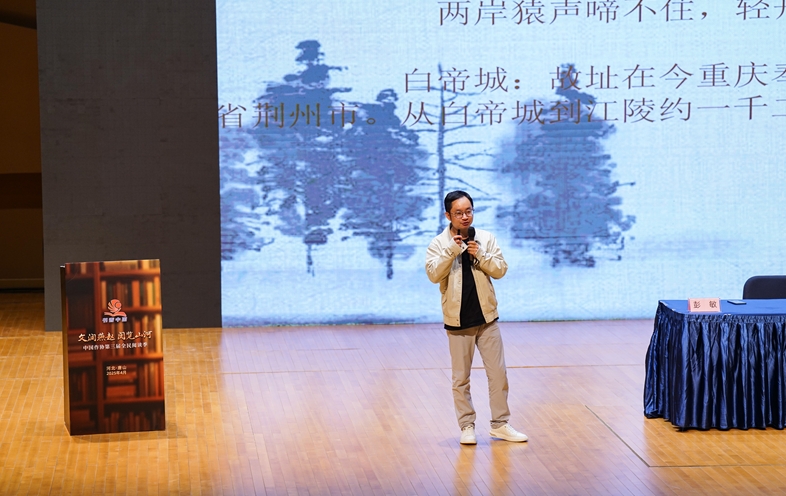 彭敏面向初中生主讲《诗词背后有乾坤》,聚焦古诗词背后的历史故事与文化内涵。他打破“标签化”的诗人形象,通过解析李白、杜甫等诗人的人生轨迹与创作背景,带领学生理解诗词中的情感逻辑与人文精神,感受古典文学跨越千年的生命力,引导青少年从诗词中汲取文化养分。在问答互动环节,彭敏带来了历史背后的有趣知识——端午节最初究竟是纪念谁的?屈原吃过粽子吗?由此鼓励学生们在阅读中积极探索,主动追问,培养勤于思考拓展知识的良好习惯。