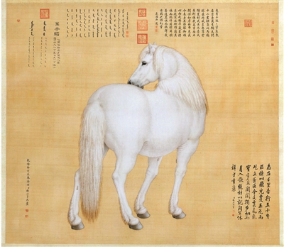 ÀÉÊÀÄþµÄ¡¶Íò¼ªóZͼ¡·×Ý238.5ÀåÃס¢ºá269.7ÀåÃ×£¬¼¸ºõÒ»±ÈÒ»»¹ÔÁËÂíµÄÐÎÏó¡£Í¼ÉÏ·½»¹Óúº¡¢Âú¡¢ÃÉÈýÖÖÎÄ×ּǼÁËÂíµÄÃûºÅ¡¢³ß´ç¡¢ÊǺβ¿ÂäºÎÈ˽øÏ×£¬¿ÉÒÔ¿´³öÕâÑùµÄ×÷Æ·´ó¶¼ÊÇ·îּдÉú¡£ÕâÆ¥½ÐÍò¼ªóZµÄ´ó°×Âí¸ñÍâÒýÈËעĿ£¬ÕâÓëÇå³õ˳ÖÎÄê¼ä½¨Á¢ÆðÀ´µÄ¡°¾Å°×Ö®¹±¡±µÄÖÆ¶ÈÓйأ¬ÏóÕ÷×ÅÖÐÑëÕþȨÓë·ªÊôÖ®¼äµÄÕþÖÎÁªÏµ¡£ÁíÓÐÒ»´ó·ùÀÉÊÀÄþ»æÖƵġ¶áÔÏ×Ӣ֥ͼ¡·£¬Ò»Ö»°×É«º£¶«ÇàͦÁ¢¾Þʯ֮ÉÏ¡£³ýÁ˾޷ù¹ÒÖáÍ⣬ÍõÖ³ϻ¹»æÓÐËõСµÄ¡¶Ê®¿¥Âíͼ¡·²á£¬»ÖÐÂíµÄÐÎÏó¡¢Ãû³ÆÒÔ¼°ÔÞÎľùÓëÀÉÊÀÄþÔ×÷Ò»Ö£¬Ö»ÊÇÌí»ÁËÊ÷ʯ±³¾°¡£