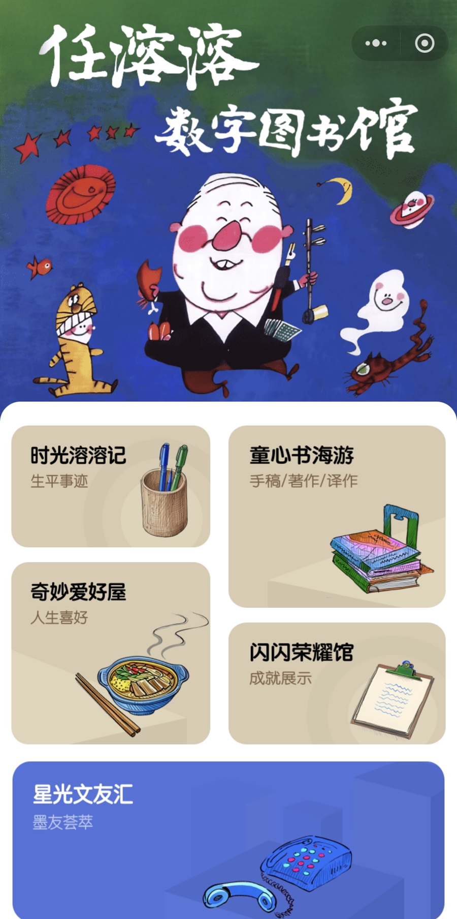 这一点,在先期上线的“任溶溶数字图书馆”的设计构架上可见一斑。搜索“遇见任溶溶”小程序,首先映入眼帘的是漫画家、被称为上海美影厂“三剑客”之一的詹同为任溶溶绘制的人物形象,生动活泼。首页小图标及小程序各板块中的插画均出自任溶溶之子任荣炼之手。这些饱含深情的创作让这个“数字图书馆”既温馨又独具特色,五个特色板块共同展现了任溶溶丰富多彩的文学人生。