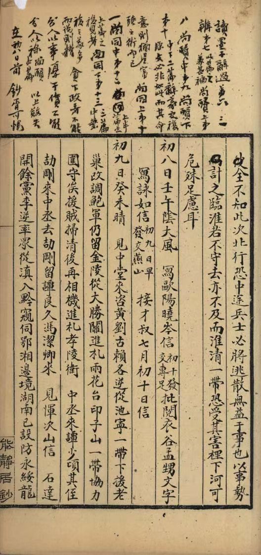 此外,钞本《能静居日记》上除了赵宽、徐震二人的校语外,还附有一些供人编选的签条,如第四册咸丰十年三月初四日上有毛笔、钢笔签条各一(图6),毛笔云“子良来自浙至不忍更闻矣选”,钢笔云“从第十行‘初四日’句抄起,至第二页第九行‘不忍更闻矣’句止”。赵烈文曾节选其咸丰十年太平军攻占浙江的部分成《赵伟甫先生庚申避难日记》在民国六年(1917)《小说月报》第八卷第一二三期上连载,毛笔签条或即供此日记摘抄;而钢笔签条起止诸句内容(不止一条),俱见罗尔纲所编《太平天国史料汇编》史部杂史类,故钢笔签条可能出于罗尔纲先生本人或转托誊抄人之手。