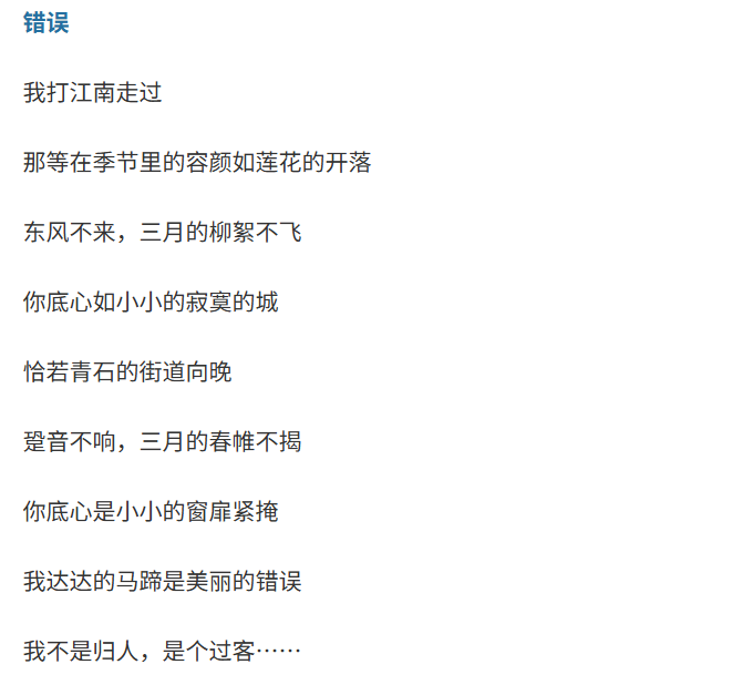 其次,这首诗看似闺怨题材,其实也可作为乡愁诗读。诗歌开篇“我打江南走过,那等在季节里的容颜如莲花的开落”,将空间环境设定在江南,而江南是几乎所有中国文人的精神原乡。所以,这首诗里游子走江南其实是一位身在台湾的诗人对祖国的依恋,诗人借书写江南梦中还乡。“这也是此诗在中国大陆引发广泛共鸣的重要原因之一。”