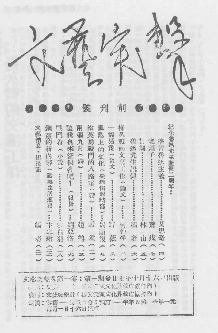 吸引了众多文化人的“边城”延安在抗战初期并没有与之相匹配的文艺刊物。这一方面是因为现实经济条件有限,另一方面则有在大城市争夺文化领导权的意思。在统一战线政策下,共产党得以在国民党的允许下公开活动,中共领袖的讲话可以公开发行,《新华日报》作为“党报”在武汉、重庆传递来自共产党一方的声音,延安派出的各类战地工作团也在西安、武汉、重庆、香港等中心城市出版丛书、发表作品。最为生动的案例是1939年初由周扬主持创办的《文艺战线》,它的编辑工作在延安完成,刊行则由桂林生活书店承担。在发刊词中,周扬就特别强调抗战将文艺实践“打成一片”,要突破“地域、交通、战争”的缺陷,拆去“名望和地位”以及“编辑和书店老板所砌高起来的那横亘在他们之间的墙”,5这最为集中地传达了一种在全国范围内开展文艺活动的诉求,呈现出统一战线视野下“抗战文学”的理想形态。