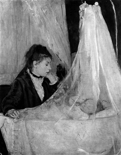 1874年4月15日,印象派首展以“落选者沙龙”之名在巴黎开幕,被后世视为现代艺术的发端。莫里索携《摇篮》参展,在这幅描绘姐姐及其刚出世女儿的画作中,母亲透过轻薄纱帐注视着婴儿,画面被一种母爱的光晕笼罩,令观者感受到那疲惫又怜爱的眼神,仿佛也被带入画中温馨静谧的氛围里。对这次在当时看来“离经叛道”的印象派首秀,学院派在绘画技法方面进行质疑,在创作风格上冷嘲热讽。如莫奈的《日出?印象》被讽刺“不过是未完成的墙纸草稿”,雷诺阿的《舞者》《剧院包厢》被责备轻浮,德加的《舞蹈课》被指责市井,而整场画展被揶揄是“六个疯子和一个女人的画展”。这一评论看似对莫里索在《摇篮》中温和的绘画语言有所认可,实则暗含给她贴上女性身份标签而未列入艺术家之意。
