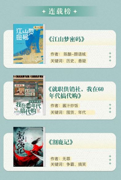 三部入选连载榜的作品《江山梦密码》《就职供销社,我在60年代搞代购》《割鹿记》,将历史与幻想交织、个体书写与时代背景融合,展现了网络文学对叙事空间的深层探索。《江山梦密码》以海丝遗址为叙事母题,牵引出宋、元、民国三段纵贯千年的守护故事,兼具历史温度与审美高度。《就职供销社,我在60年代搞代购》作为“系统文”与“年代题材”的融合案例,借助通俗化叙事桥段展现个体在特殊历史背景下的自我谋划与家庭经营,折射出网络文学在描绘历史转型与社会变迁时的新型表达路径。而《割鹿记》通过“埋尸人”独特视角揭开大唐盛世表象之下的暗流汹涌,体现了成熟作者对历史幻想题材更深层次的驾驭与探索。