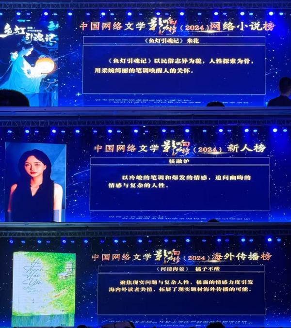 6月17日,“2024中国网络文学影响力榜发布仪式”在江苏盐城举行,电竞竞猜官网网络文学中心现场发布了年度中国网络文学影响力榜,网络小说榜、IP影响榜、海外传播榜、新人榜四个子榜单一一揭晓。其中盐言故事同时斩获三项荣誉,米花的《鱼灯引魂记》入选网络小说榜,核融炉位列新人榜,橘子不酸的《河清海晏》则荣膺海外传播榜。