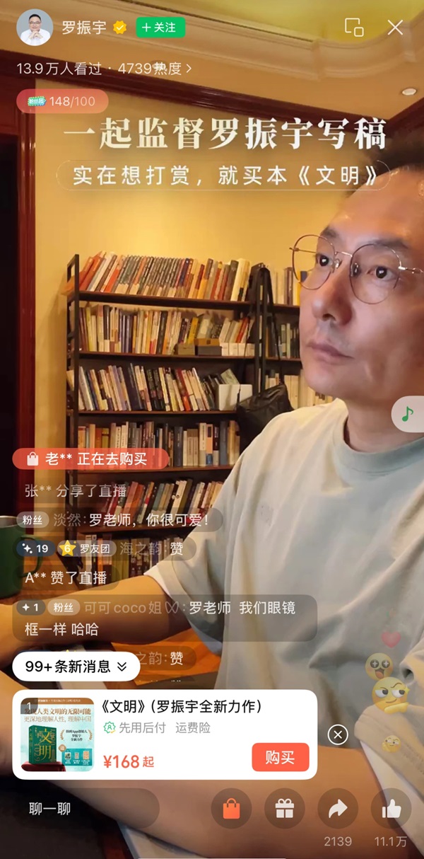 同时,罗振宇直播间屏幕上不断跳出《文明》被抢购的成交提示,商品页销量显示2700多本,更成为这种写作直播的附加产品。