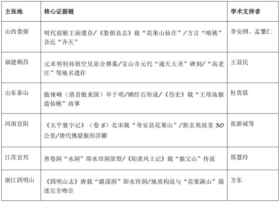 关于花果山的原型,学界有不同观点,现将几种学说谱系列表如下: