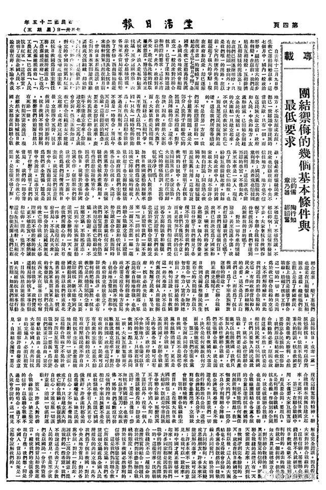 1936年5月31日至6月1日,在宋庆龄、马相伯、沈钧儒、章乃器的号召和领导下,“全国各界救国联合会”在上海召开了成立大会,选举宋庆龄、何香凝、马相伯、邹韬奋等四十余人为执行委员,沈钧儒、章乃器等十人为常务委员。7月15日,救国会领导人沈钧儒、章乃器、陶行知、邹韬奋发表了《团结御侮的几个基本条件与最低要求》一文,更是明确表示,赞同和支持中国共产党的抗日民族统一战线政策。救国会这一代表全国大多数人民意志和要求的呼声,引起了国内各界人士的重大反响,特别得到了中国共产党的赞同。