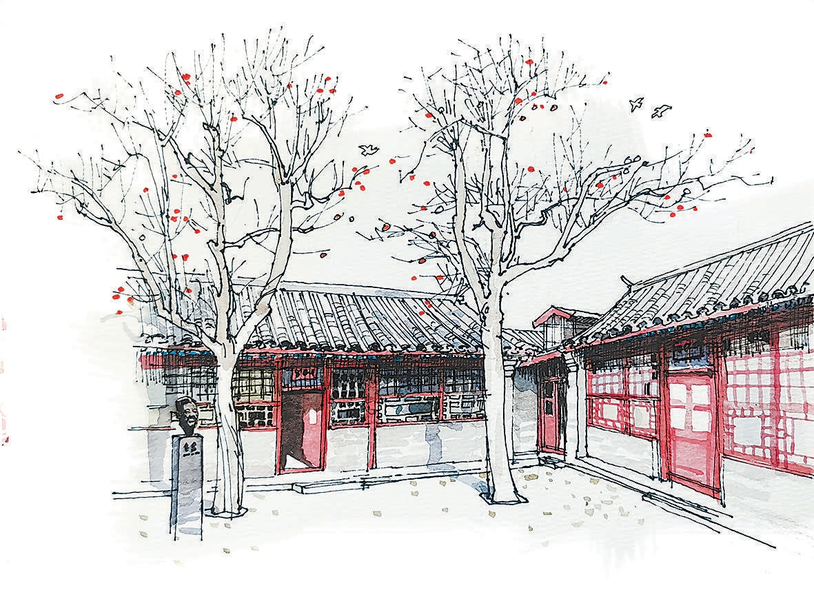 本书选用了69幅穆力兵老师绘制的钢笔淡彩和水彩插图,以及一幅手绘的北京名人故居参观路线图。近六年来,穆力兵老师不惧严冬酷暑,不断往来现场观察写生,在画室内静心思考、潜心创作。宋庆龄故居中的海棠树三月时花开似锦,可故居中的凤凰树直到六月才浓荫遮日生机盎然;老舍故居的柿子树要等到九月红彤彤果实才挂满枝头;齐白石故居只有到相邻楼房的房顶,才能一窥全貌……想要捕捉到最美的瞬间,就要反复探访,仔细甄选。本书中,于谦故居一章中有一幅西裱褙胡同23号门牌的插图,这一胡同二十年前就消失了。高大气派的写字楼、办公楼拔地而起。而那块仍然钉在故居门框上的门牌,成为这一区域世事变迁的实物例证。清新淡雅、轻松愉悦的钢笔淡彩和水彩画,与名人故居特有的安静平和气质、温馨惬意氛围最相契合。较之照相,绘画更易于将自己的情感,融入于笔下故居的一花一草、名人的一颦一笑之中。在与穆老师共同考察时,我也详细讲解每一座故居的建筑特色、精到之处,力争文字描写与绘画相得益彰,引导读者领悟——那些外观看似相像的建筑,其实各有各的精彩。贝家花园的雕楼,既像周边地区清代时建造的仿川北苗族石雕楼,也似贝熙叶大夫故乡的法式古城堡门楼。齐白石故居长廊什锦窗的冰裂纹木雕,蕴含的是天人合一、妙趣天成的中国传统美学思想。